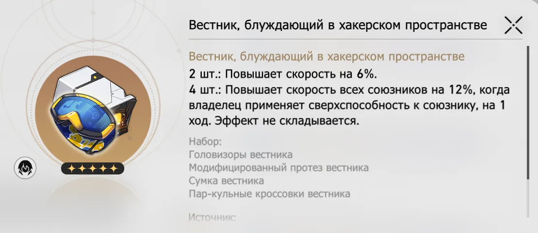 «Первооткрыватель мёртвых вод» / «Вестник, блуждающий в хакерском пространстве» — лучшая комбинация для Цзяоцю, повышающая урон по противникам с ослаблениями и скорость. Комплект увеличивает собственный урон лекаря и позволяет герою ходить чаще, восстанавливая тем самым ульту и чаще накладывая на врагов ослабления.