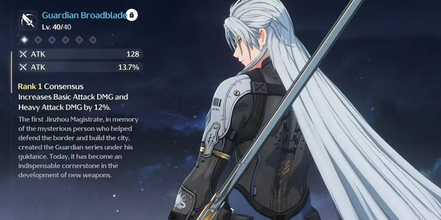Guardian Broadblade («Широкий клинок стража») — трёхзвёздочное оружие, которое можно экипировать Цзияню за неимением мечей эпической редкости или на самом старте игры. Клинок повышает урон базовой и тяжёлой атаки на 24% и даёт небольшой прирост к силе атаки.