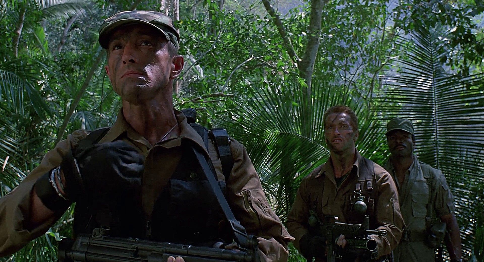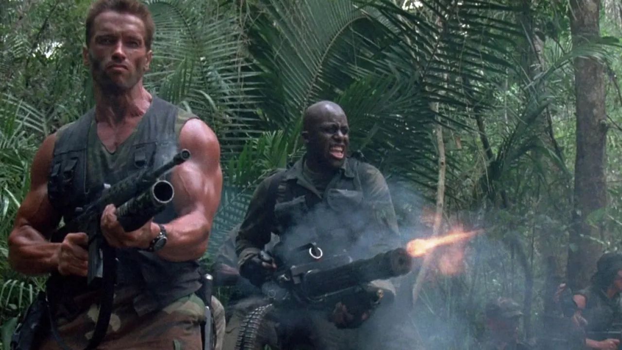 Что ж, это тяжёлая артиллерия боевиков. И да, здесь, как и со Сталлоне, был другой очевидный кандидат — «Терминатор», но нет. «Хищник» — тот фильм, где роль Шварценеггера для меня любимая. И как же я боялся этой картины в детстве! Какая-то невидимая угроза выслеживает своих жертв и подвешивает их выпотрошенные тела за ноги на деревьях, а затем собирает их черепа с позвоночниками в коллекцию. Идеальный охотник, идеальный убийца, которому неинтересно возиться с безоружными или теми, кто не может дать отпор. А группа спецназовцев — это же идеальная дичь.