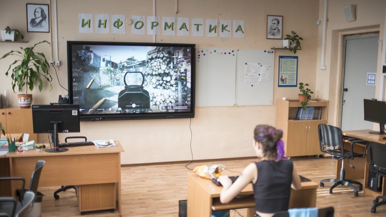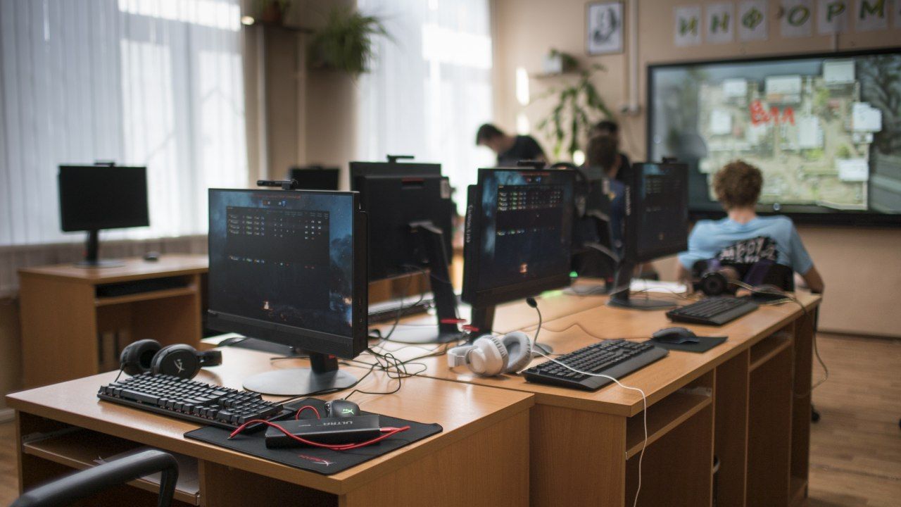 Это мы нашли почти случайно. В 2017-2020 годах российские школы были массово модернизированы. В Москве вместо грифельных досок висят огромные, во всю стену, экраны с тачскрином и подключением к интернету (сеть называется МЭШ — Московская электронная школа). В областях завозят современные компьютеры (в одной нас спросили: «Показать ферму 3D-принтеров?»). Классы информатики не надо переоборудовать. Понятно, что широкоформатные игровые мониторы в них не стоят, а гарнитуру лучше принести свою. Но в целом все есть.