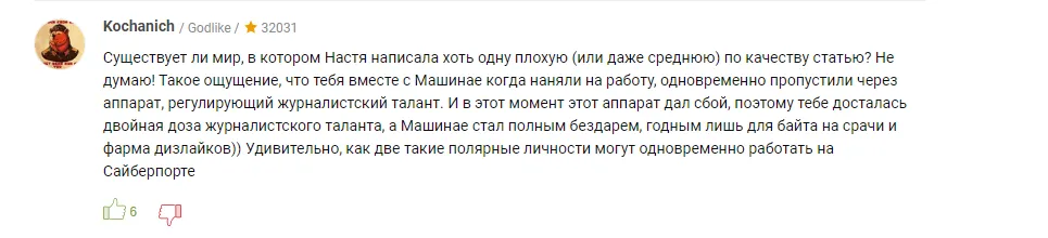 Когда только пришел работать на Cybersport.ru, я активно читал комментарии и сам пытался участвовать в жизни комьюнити сайта, отвечая и помогая пользователям. Однажды даже завел второй аккаунт, чтобы спокойно общаться с читателями не с позиции автора. Однако чем дольше я пытался влиться в «тусовку», тем сильнее разочаровывался в людях, наблюдая, как многие из них бесконечно «набрасывают на вентилятор». В итоге я почти полностью отказался от чтения комментариев, поэтому и назвать любимого пользователя затрудняюсь.