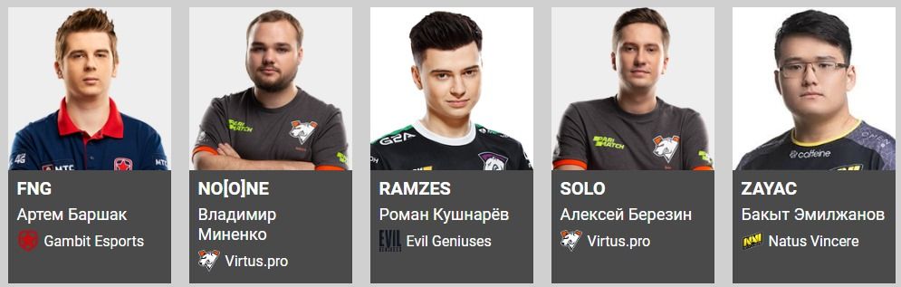 На момент публикации материала вся первая пятерка в голосовании идет практически нога в ногу. Пока лидирует Владимир No[o]ne Миненко, но отставание других игроков минимально. В категории «Свой вариант» пользователи чаще всего голосуют за Данила gpK~ Скутина, Данила Dendi Ишутина и Илью Lil Ильюка.