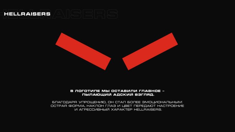 По словам представителей организации, при разработке логотипа оставили главное — пылающий адский взгляд. Они также объяснили, что логотип «стал более эмоциональным: острая форма, наклон глаз и цвет передают настроение и агрессивный характер HellRaisers».