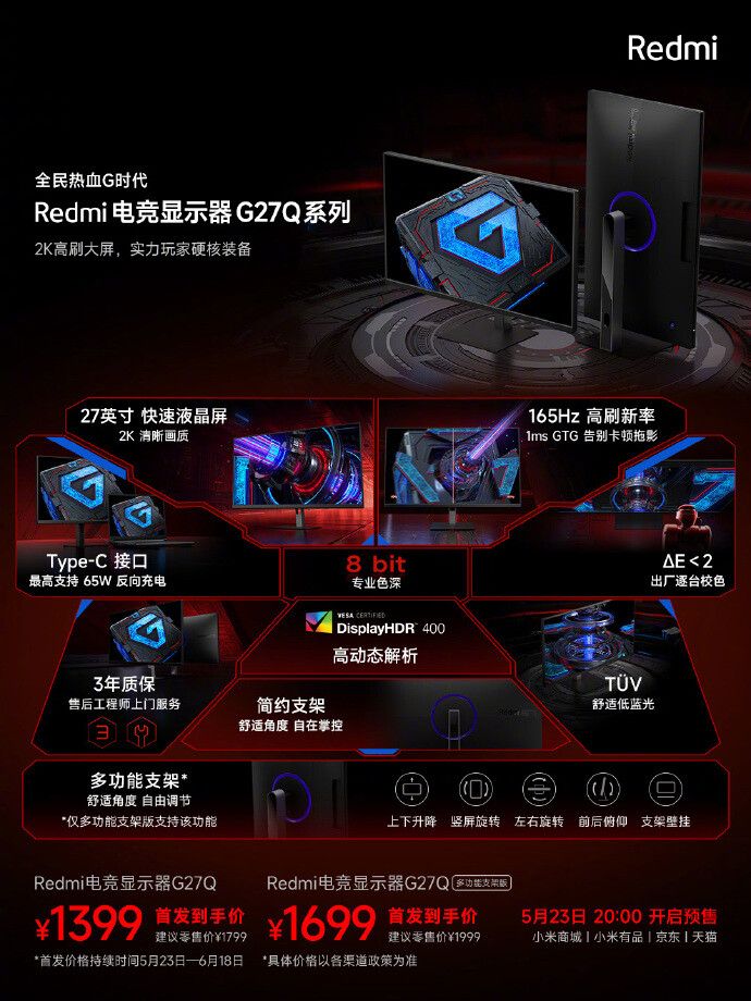 В линейке также присутствует более дорогая модель Redmi G27Q за $200. Её характеристики аналогичны младшей модели G27. Разница только в максимальном разрешении, которое на G27Q составляет 2K.