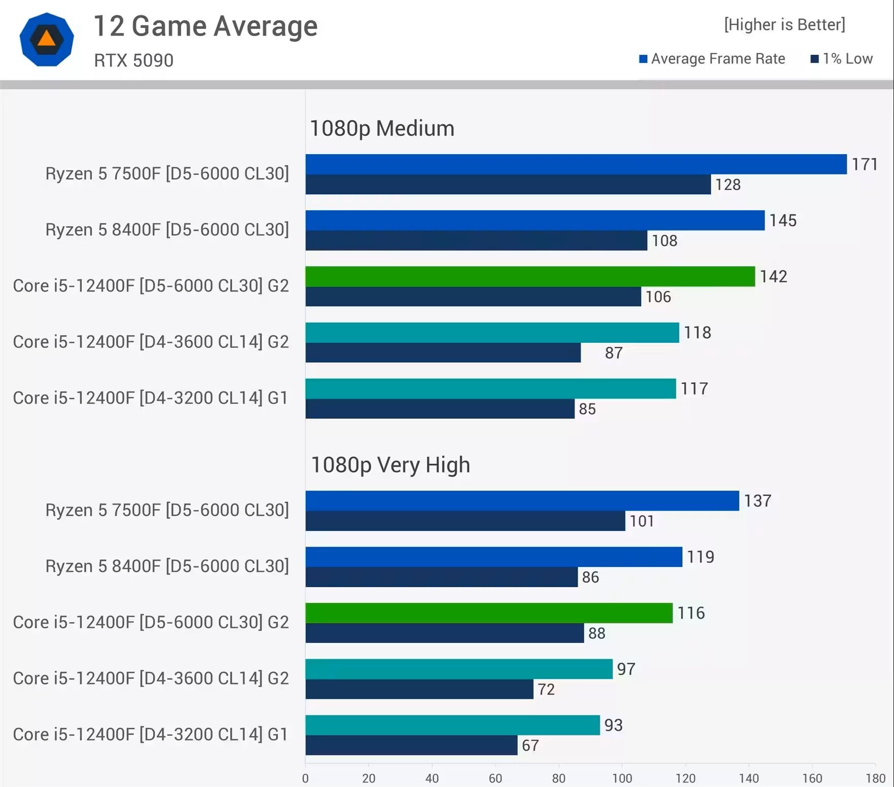 В качестве стенда специалисты использовали компьютер с видеокартой Asus ROG Astral GeForce RTX 5090. В него устанавливали процессоры Intel Core i5-12400F под разные форматы памяти, а также схожий по производительности Ryzen 5 8400F, но только под DDR5. Помимо этого, чтобы увидеть влияние процессора на отдачу от ОЗУ, TechSpot проверял частоту кадров с более мощным Ryzen 5 7500F также с памятью DDR5.
